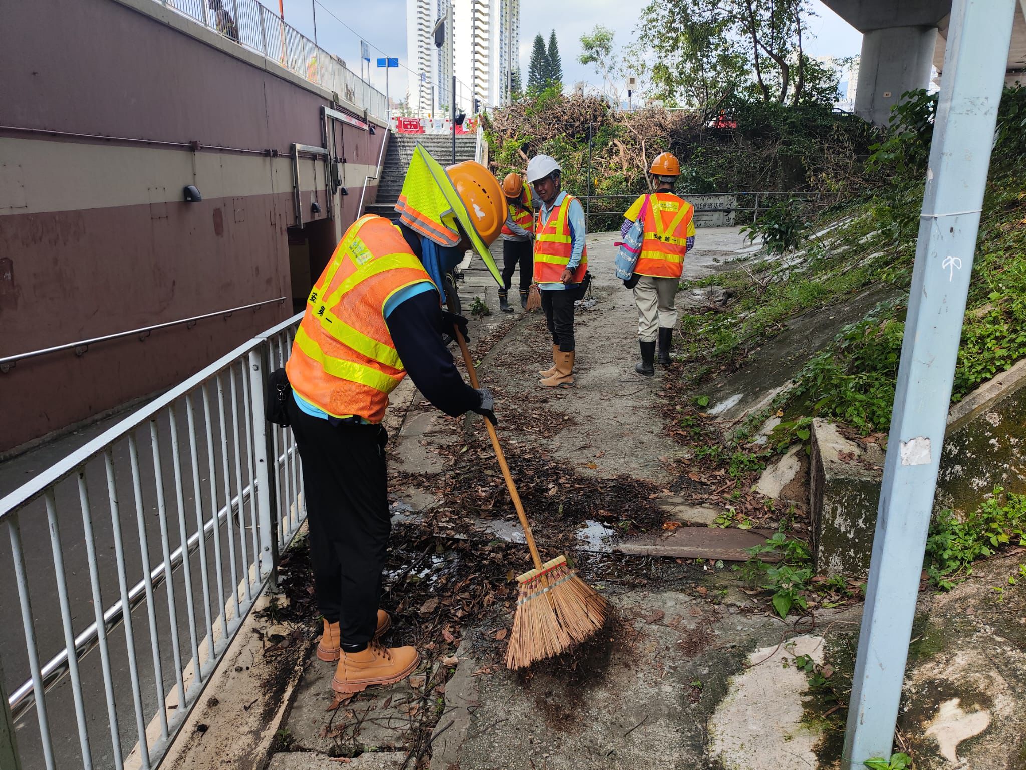 颱風韋帕襲港後,T4 團隊到社區探訪,包括到沙田頭村及曾大屋向村代表了解風後的情況,並協助清理附近渠道、樹枝和落葉等,預防渠道淤塞,保持村內環境整潔。